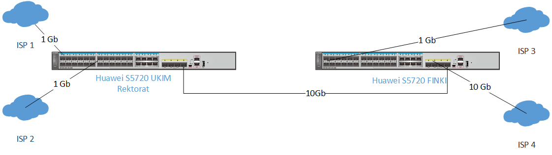 На секоја локација е инсталиран мрежен преклопник XENIA QUANTA LY2R QNOS, додека врската помеѓу уредите е 40Gbit (со можност за надградба на 2 x 40 Gbit)